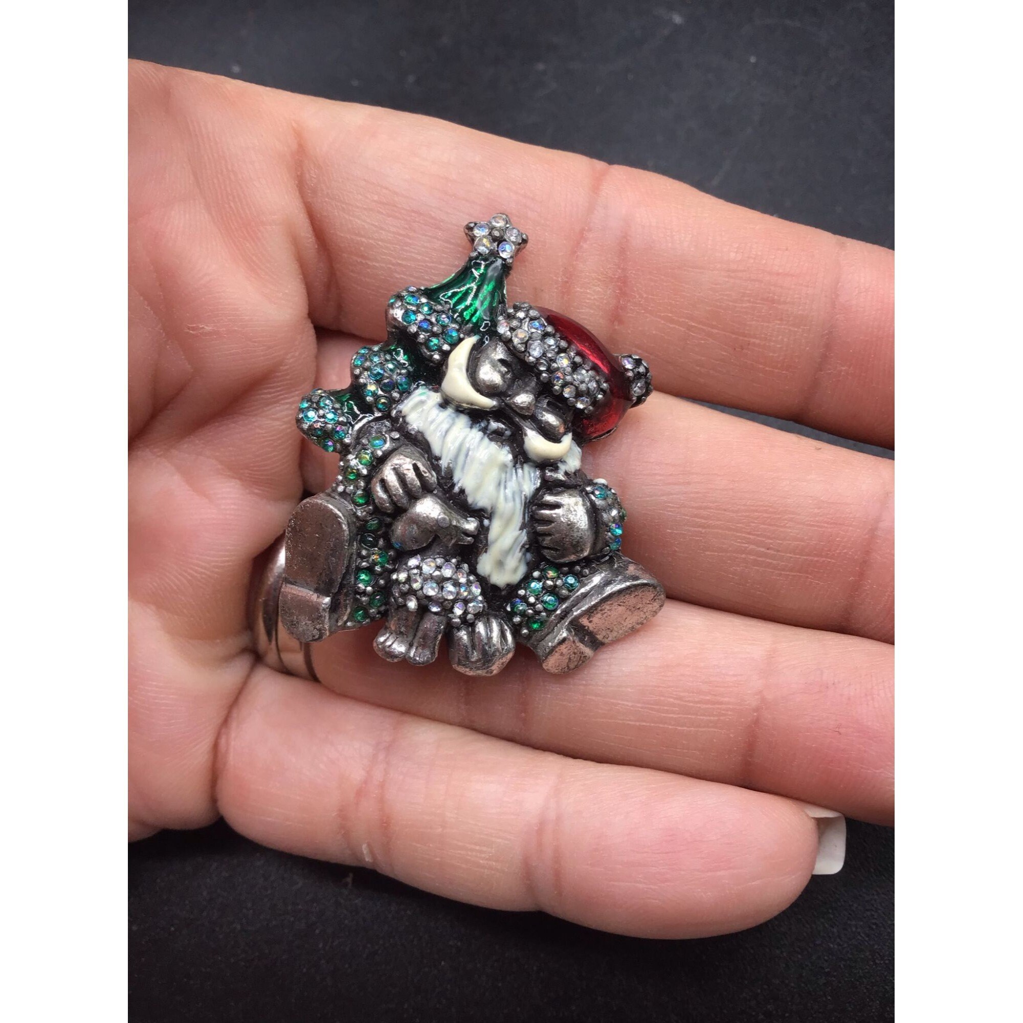 Santa Claus with Dog Christmas Tree Pin Brooch Rhinestones Xmas Holiday Jewelry