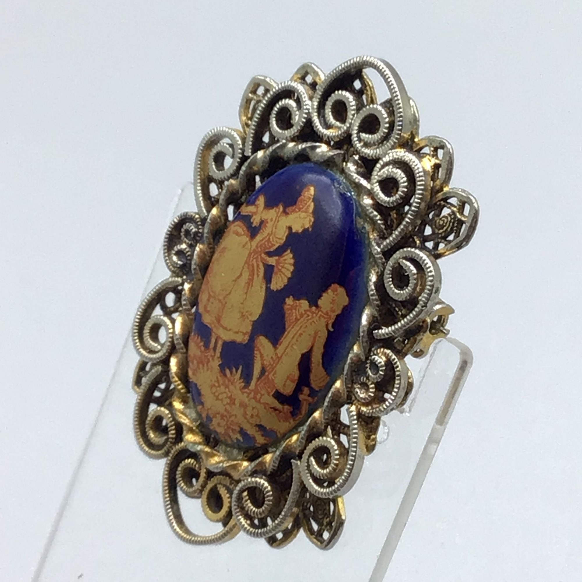 Vintage Romantic Scene Cameo Style Brooch Pendant Blue Ceramic Gold Tone Setting