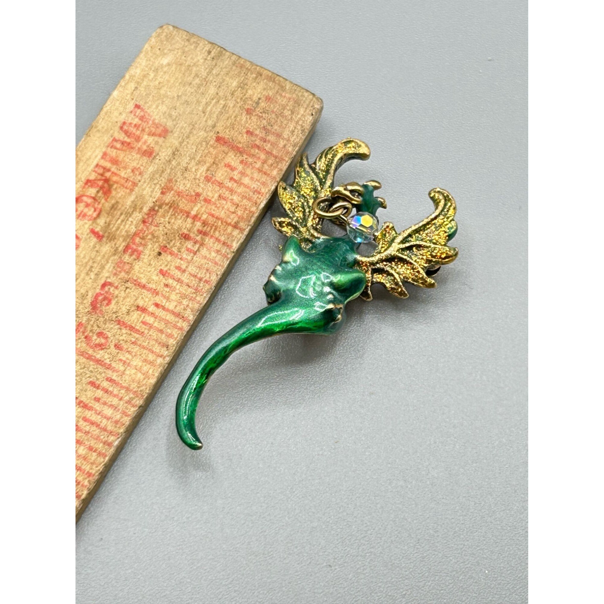 Signed Kirks Folly Dragon Pin Brooch Green Enamel Fairy Dust Crystal Bead Dangle