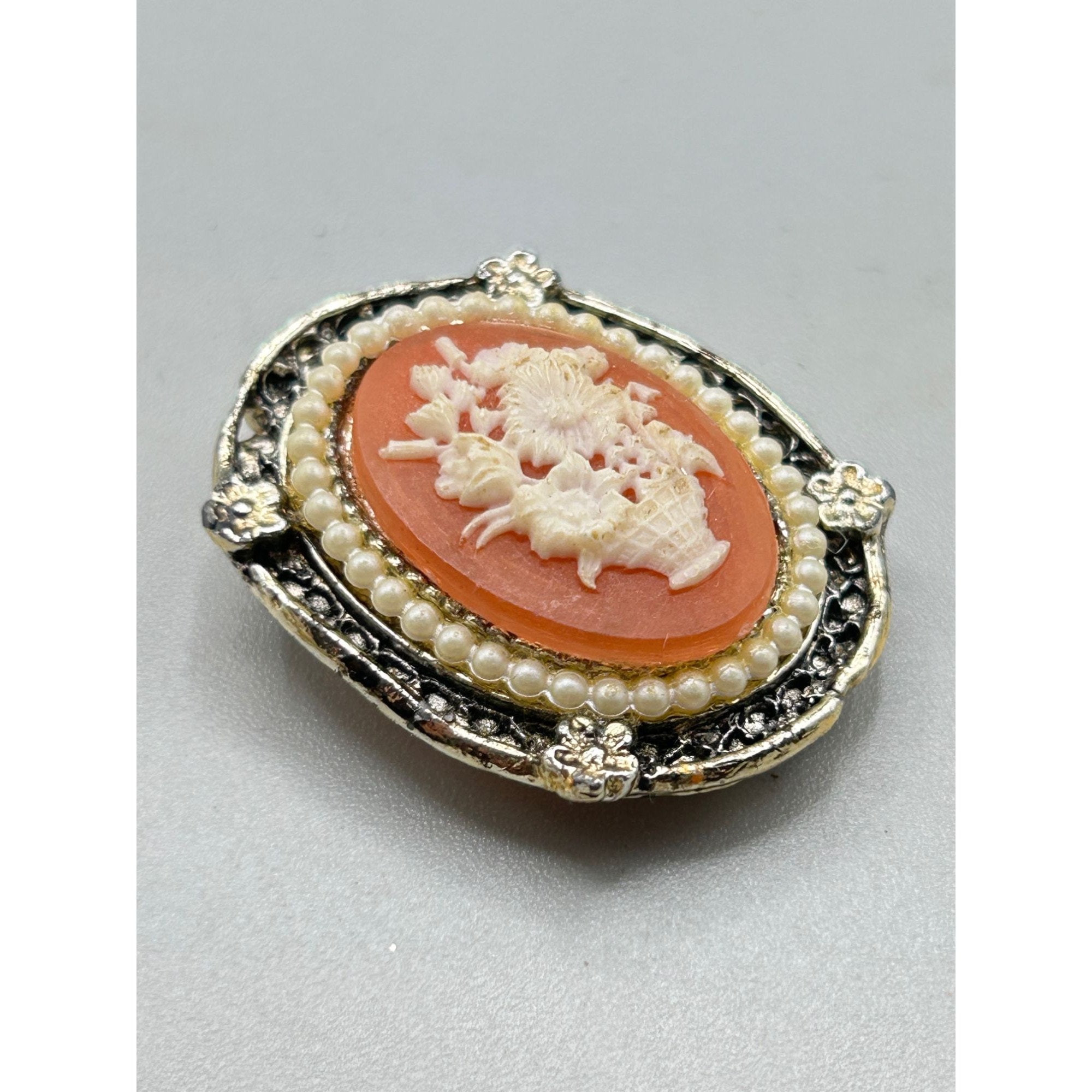 Vintage Resin Cameo Brooch Floral Vase Design Faux Pearls Frame Double As Clasp