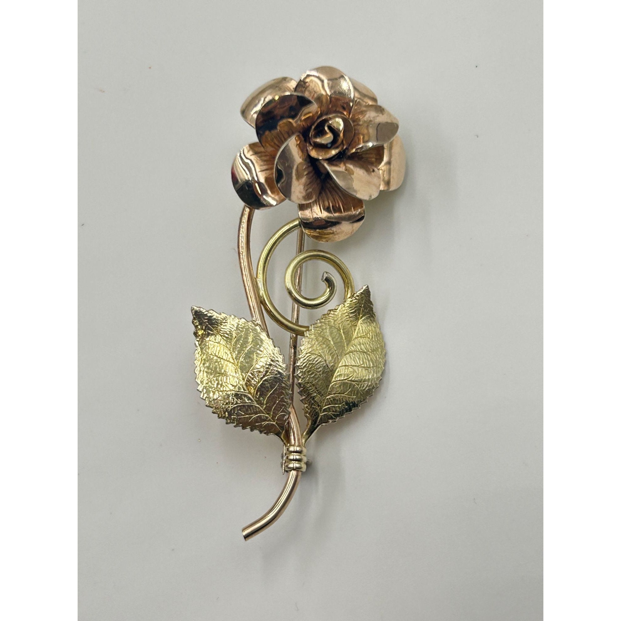 Vintage Signed DIANA Krementz Rose Flower Pin Brooch with Stem Gold Rolled Pin