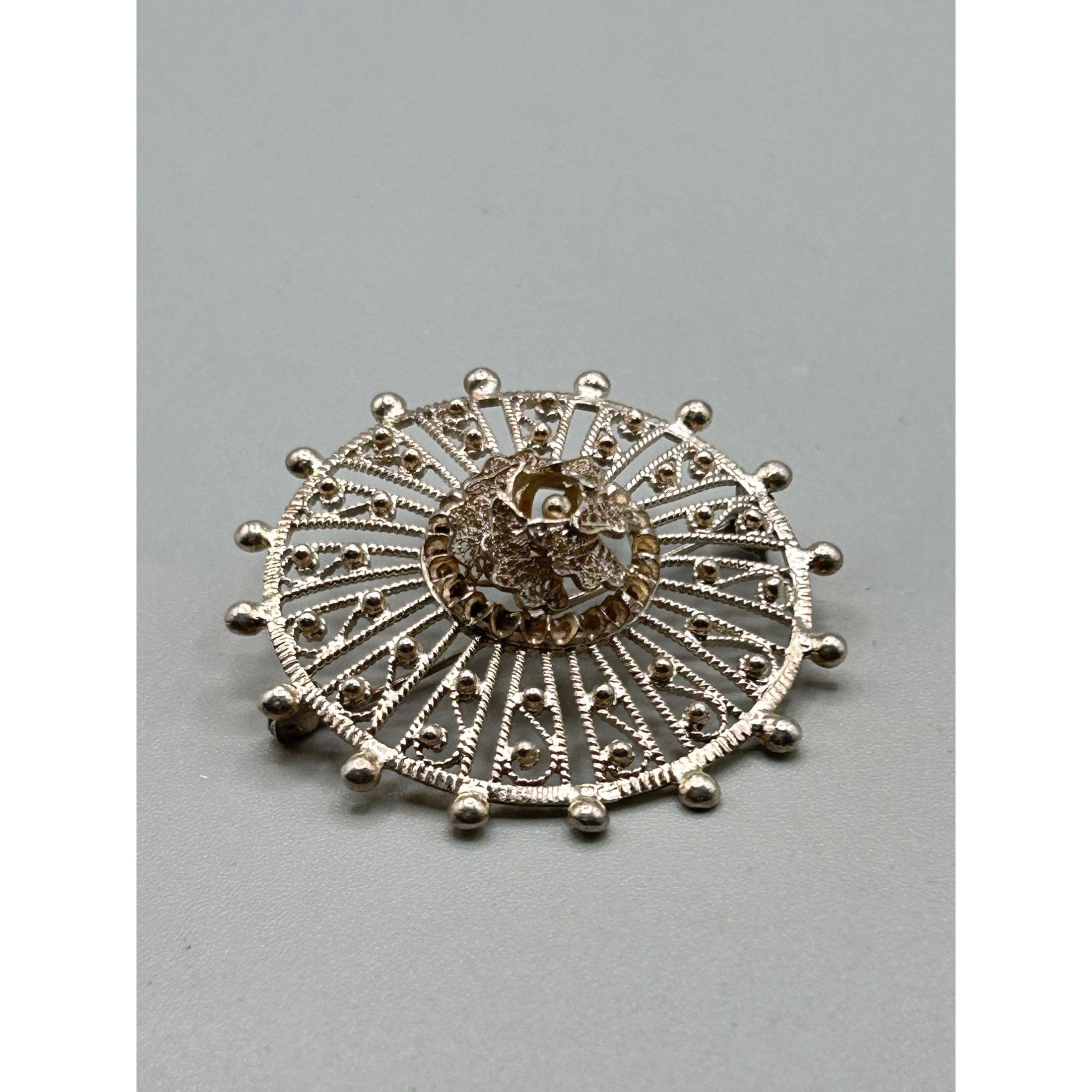 Vintage Sterling Silver Spun Silver Filigree Pin Brooch Round Wheel Sunburst Pin