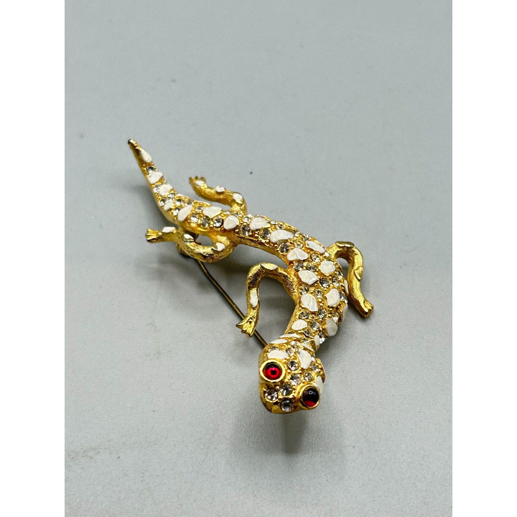 Vintage Gecko Pin Brooch Gold Tone with White Enamel Spots Animal Figural Pin