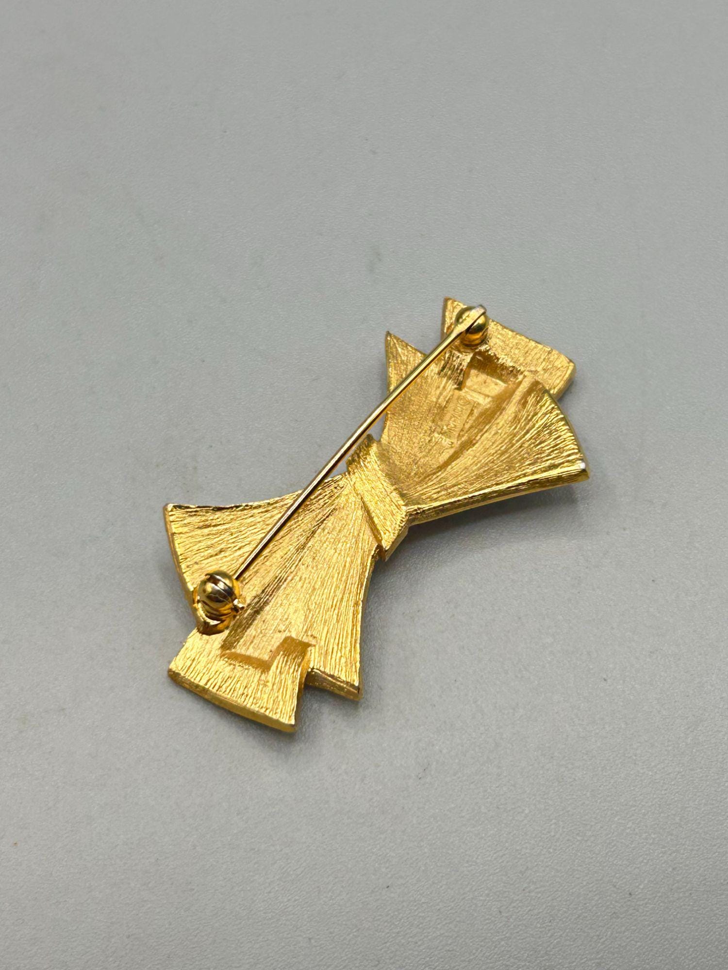 Vintage Signed TRIFARI White Enamel Ribbon Bow Pin Brooch Gold Tone Metal