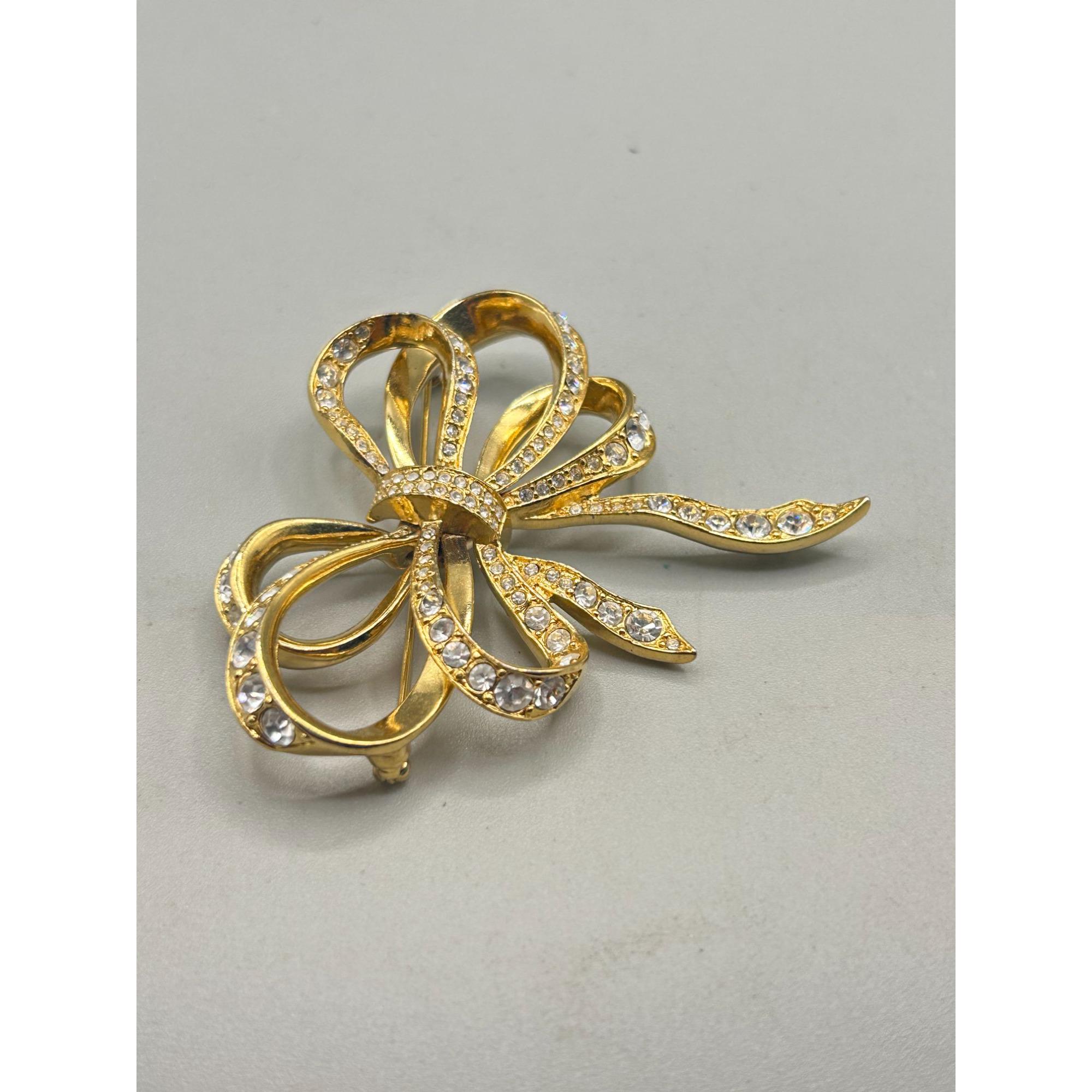 Vintage Bow Pin Brooch Gold Tone and Rhinestones Ribbon Fancy Elegant Pin