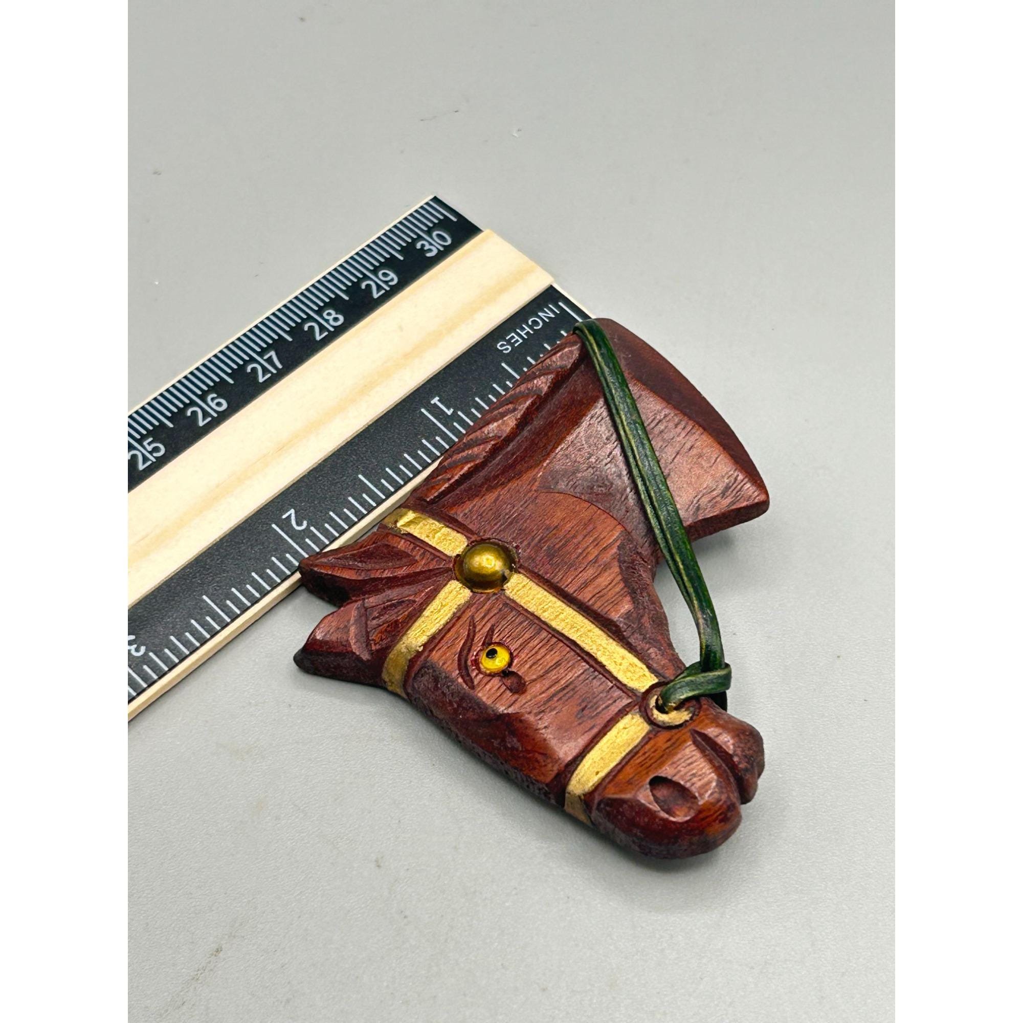 This finely handcrafted wooden brooch features a detailed horse head design, accented with gold paint and a green strap.
