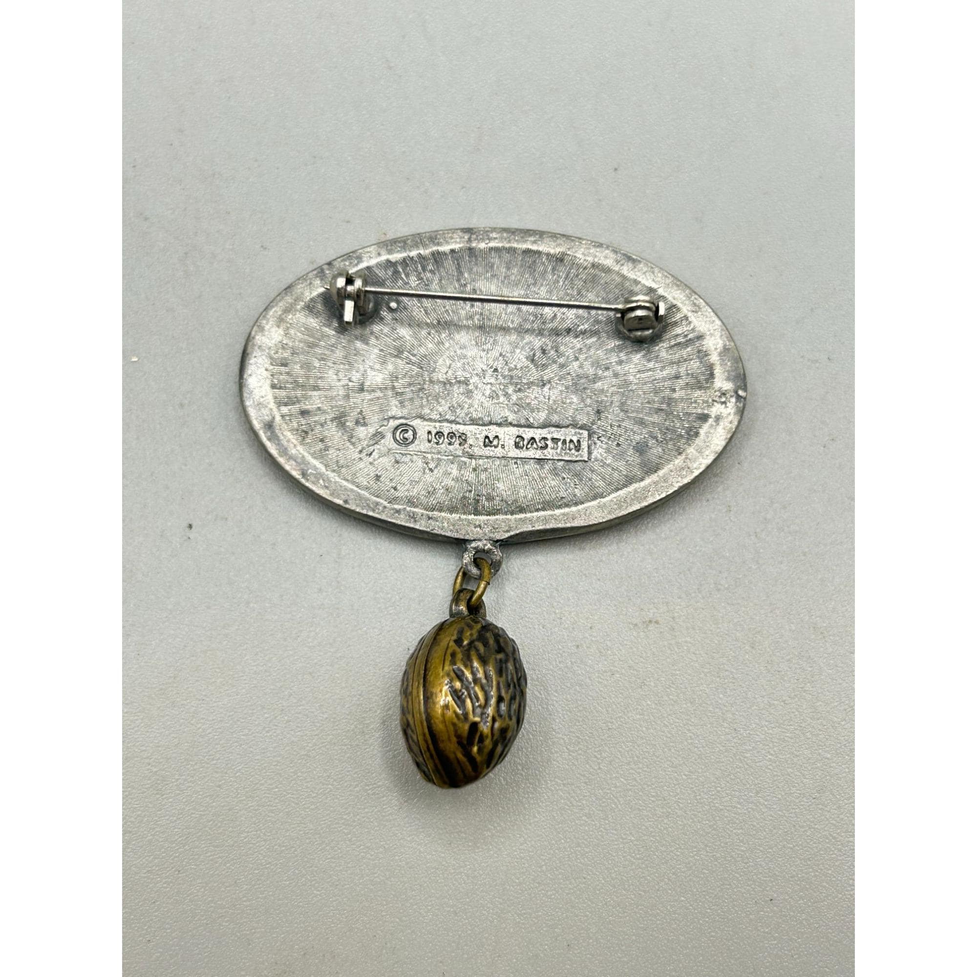 Charming brooch pin featuring an illustration of a bunny by Marjolein Bastin, dated 1999. Includes a unique dangling charm. Ideal for vintage jewelry collectors.