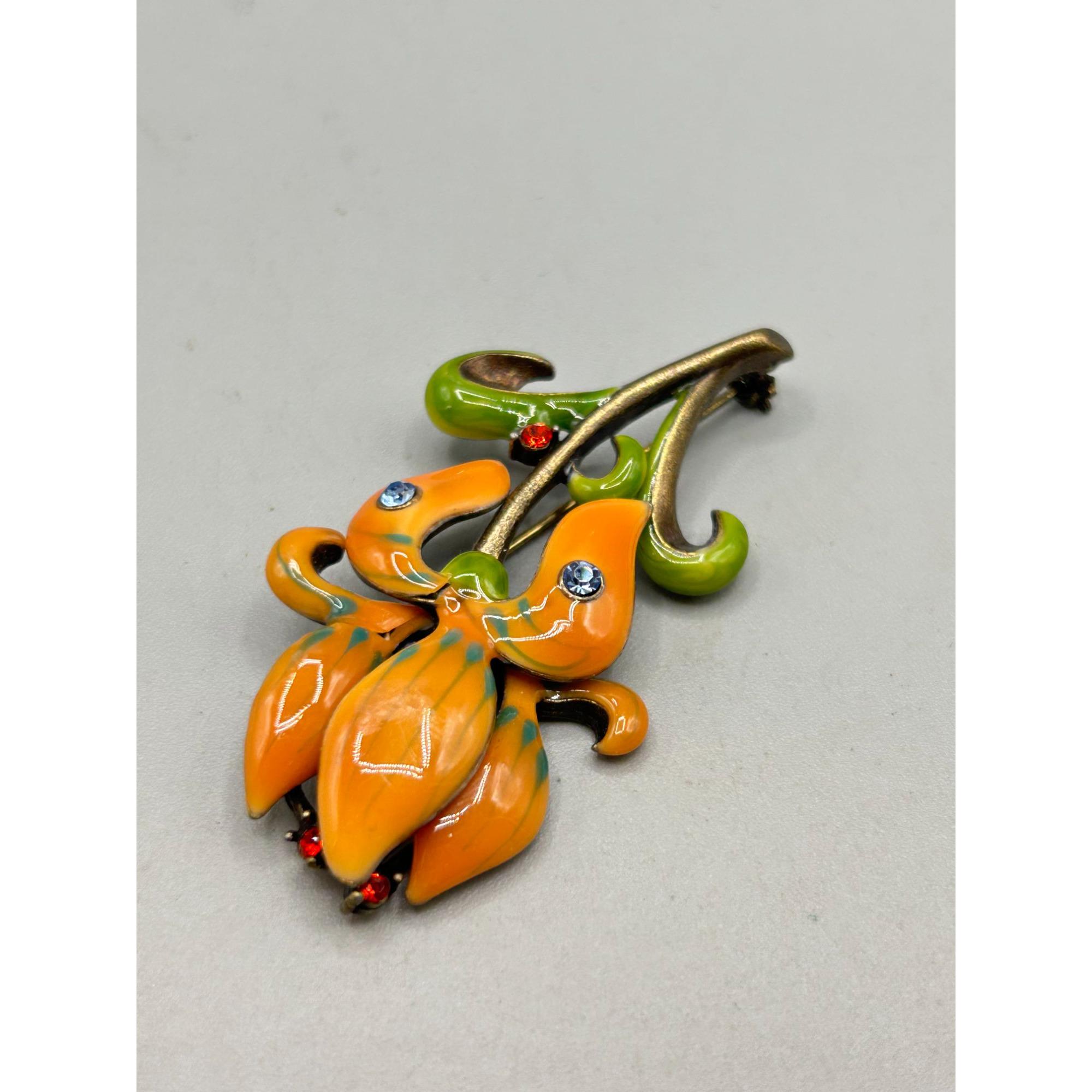Vintage Orange Enamel Flower Brooch With Rhinestone Accents & Gold-Tone Metal Base