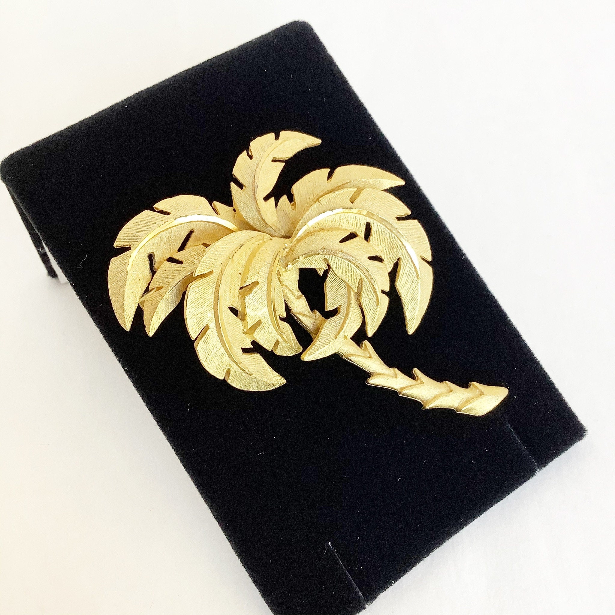 Palm tree brooch tropical vacation pin in a gold tone textured vintage costume jewelry