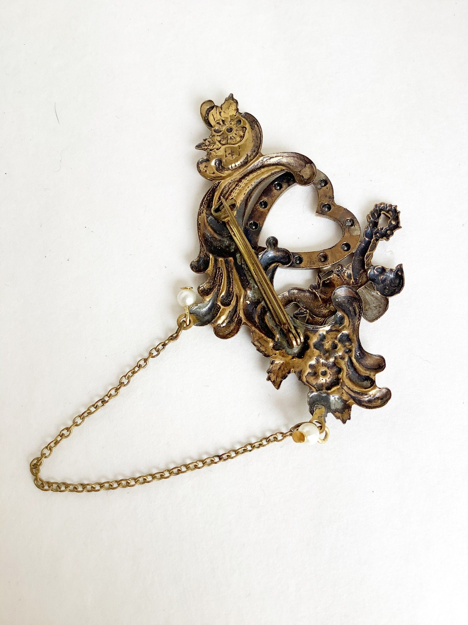 angel brooch angel with heart and chain dangle gold angel pin stamping style vintage costume jewelry